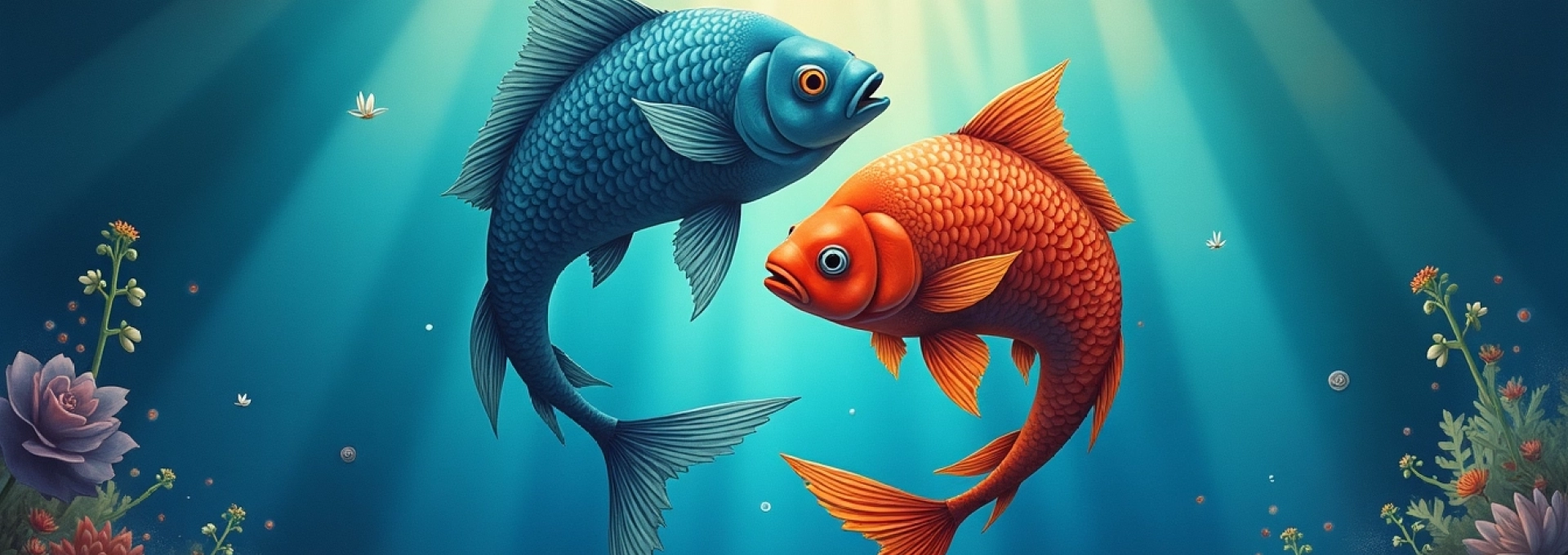 Les Poissons, navigateurs des émotions, errent dans un océan de sensibilité. Nés entre le 19 février et le 20 mars, ils sont gouvernés par la planète Neptune, symbole de l’imagination et du rêve. Le signe des Poissons est représenté par deux poissons nageant en sens inverse, illustrant leur double nature : l’un tourné vers le monde extérieur, l’autre vers leur monde intérieur.